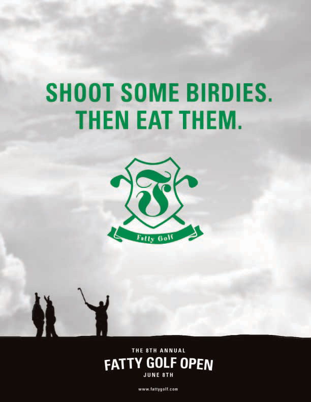 Believe it or not, this tournament is real. Thank goodness it's for charity. The only rule (besides the rules of golf) is that all players must be over 250 lbs. These spots and posters ran locally around the event.